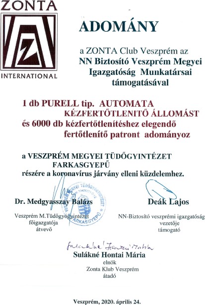 „A decemberben megrendezett jótékonysági Adventi koncerten – a Rotary Club Balatonfüred–Veszprém, a Rotary Club Veszprém, a Veszprém Lions Club és a ZONTA Club Veszprém összefogásával – 2.017.300 Ft gyűlt össze a Bara-ház javára.”