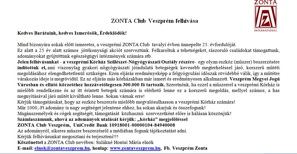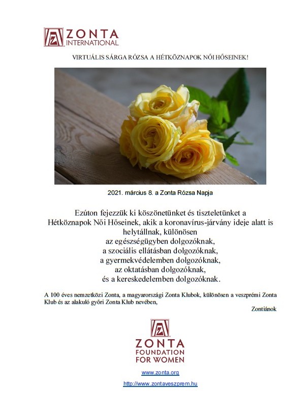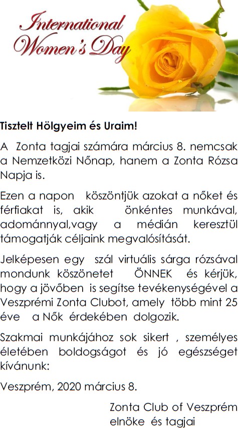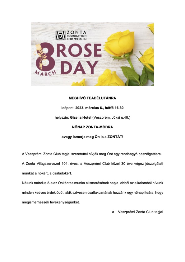 Szeretettel meghívjuk a Zonta nőnapi rendezvényére 2025. március 10-én 16 órára a Hotel Gizella kistermébe. További információkat az alábbi dokumentumban talál.
